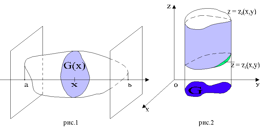 3. Пусть теперь тело T представляет собой "цилиндрический брус", ограниченный снизу и сверху, соответственно, поверхностями z = z1(x, y) и z = z2(x, y), проектирующиеся на плоскость xy в некоторую квадрируемую фигуру G (рис.2), z1(x, y) и z2(x, y) - непрерывны в G. Тогда
