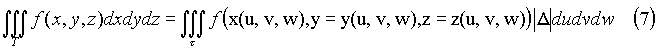 Переходя в этом равенстве к новым переменным по формулам (6), получим выражение объёма области T в криволинейных координатах