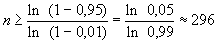 Пример 8. Большая партия изделий содержит один процент брака. Каков должен быть объем случайной выборки, чтобы вероятность встретить в ней хотя бы одно бракованное изделие была не менее 0,95.Решение