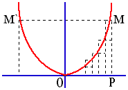 Для вычисления площади Q фигуры OPM, образованной частью ОМ параболы y=ax2, отрезками PM и ОP применить следующий прием: Разобьем отрезок ОР на n равных частей и построим на них ряд входящих и выходящих прямоугольников. Площади Qn и Q'n,составленные из них ступенчатых фигур разнятся площадью (x/n) y наибольшего прямоугольника. Отсюда, разность Qn-Q'n стремится к 0 и, т.к. Qn MOM'=(4/3)xy Используя описанный прием, найти ( хотя бы приближенно, с точностью до 3-го знака) площади фигур, расположенных над отрезком ОР и лежащих под кривыми: | 1. y=(x/a)1/2 | 0<=x<=a | Вариант 1-5 | | 2. y=b(1-(x/a)2)1/2 | 0<=x<=a | Вариант 6-10 | | 3. y=1/x | 1<=x<=a | Вариант 11-15 | | 4. y=(a2+x2)1/2 | 0<=x<=a | Вариант 16-20 | | 5*. y=sin(x/a) | 0<=x<=min(a,П/2) | Вариант 1-20 | Замечание Содержание |