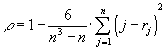 Ј iЈ n. Упорядочим эти пары по возрастанию чисел Xi и их порядковый номер j (1Ј jЈ n) назовем рангом чисел Xi. Если несколько чисел совпадают по величине, то каждому из них присваивается ранг, равный среднему арифметическому их номеров. Порядок чисел Yi также, естественно, изменится. Если отдельно упорядочить числа yi по возрастанию, то их порядковый номер r тоже становится рангом чисел Yi. Но поскольку эти числа имеют смысл только в паре между собой, ранги r чисел Yi перемещаются и получается пар n чисел рангов (j, rj), где 1Ј jЈ n.Если признаки взаимосвязаны, то возрастание j влияет на порядок, в котором следуют ранги r
