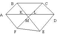 Ответ: 1999:1998. Это легко следует из того, что будет нами доказано: диагонали AD, BE и CF пересекаются в одной точке. Треугольники AKB и DKE равновелики (если К – точка пересечения диагоналей AD и BE), CLD и FLA тоже равновелики и EMF и BMC тоже равновелики (где L и M – соответствующие точки пересечения). Поэтому имеем три равенства: АК . ВК= DK . EK, CL . DL= FL . AL и EM . FM= BM . CM. Перемножив их, получим AK . BK . CL . DL . EM . FM = AL . BM . CM . DK . EK . FL. Это равенство противоречит рисунку, из которого видно, что каждый множитель в левой части меньше соответствующего множителя в правой части равенства.