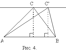 Свойство 3. При фиксированном основании AB для любых двух точек C и С', лежащих на прямой, параллельной AB, площади треугольников ACB и AC'B равны (см. рис.4).