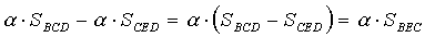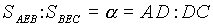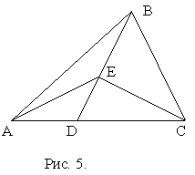 Свойство 4. Пусть в треугольнике ABC точка D лежит на отрезке AC, точка E лежит на отрезке BD. Тогда SABE : SCBE = AD : DC.