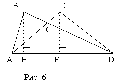 SABC=SACD. Так как эти треугольники имеют общее основание AD , то из формулы (1) следует, что длины перпендикуляров BH и CF (см. рис.6) к прямой AD , опущенных из точек B и C, равны. Но тогда четырехугольник BCFH является параллелограммом (BH=CF, BH | | CF) и, следовательно, BC | | AD.Допустим теперь, что