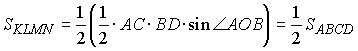 Аналогично можно показать, что KN = LM = 1/2 BD, KN ззBD и LM ззBD. Площадь параллелограмма равна произведению длин его сторон на синус угла между ними, т.е. Учитывая, что KL = 1/2 AC, KN = 1/2 BD и sin РLKN = sin РAOB (углы LKN и AOB являются углами с взаимно параллельными сторонами), получаем , |