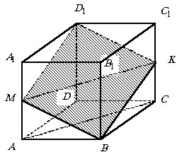 При условии примера 7.1.12 и с учетом того, что Е, F и G – середины соответствующих ребер и a – длина ребра куба, доказать правильность шестиугольника EMFKGL и найти его площадь.