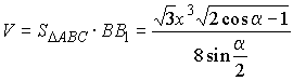 Объем правильной треугольной призмы равен V. Угол между диагоналями двух граней, проведенными из одной и той же вершины, равен a. Найти сторону основания призмы.
