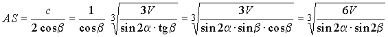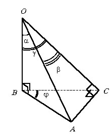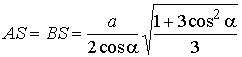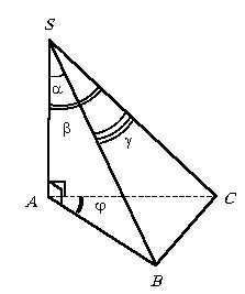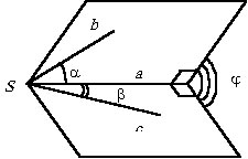 называют аналогом теоремы косинусов для трехгранного угла (с вершиной S и ребрами SA, SB, SC). Это равенство (14) полезно запомнить. Оно дает возможность по трем известным углам из a, b, g и f, где a, b О(o;p/2) и g, f О(o;p), определить оставшийся четвертый угол. Оказывается в некоторых ситуациях можно даже по двум известным углам из указанных определить два других. Одна из таких известных в школьном курсе ситуаций описана в следующем задании.
