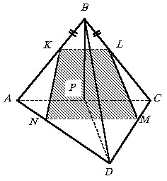 С точностью до обозначения буквами вершин тетраэдра можно считать, что вершины К, L, M и N сечения лежат на ребрах АВ, ВС, CD и AD соответственно. Сначала рассмотрим ситуацию, когда BK = BL (см. рисунок). В этой ситуации KL ||AC, а значит, прямая KL параллельна плоскости треугольника ADC. Поэтому плоскость, проходящая через KL, пересекает плоскость треугольника ADC по прямой, параллельной KL, т.е. KL ||MN. Откуда MN || AC, а значит, DN = DM. |