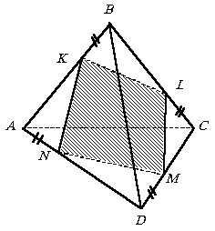 Из равенства треугольников NAK, KBL, LCM и MDN следует NK = KL = LM = MN, т.е. KLMN – ромб, а значит, KN || LM. По признаку параллельности прямой и плоскости получаем, что прямая KN параллельна плоскости треугольника BCD. Так как AK = 2 и AN = 1, то , а значит, прямые NK и DB пересекутся в плоскости треугольника ABD, что противоречит параллельности прямой KN и плоскости треугольника BCD. Пришли к противоречию. |