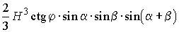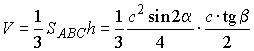 В основании треугольной пирамиды лежит треугольник с острыми углами a и b. Боковые ребра наклонены к плоскости основания под углом f , высота пирамиды равна H. Найти объем.