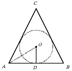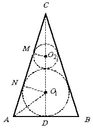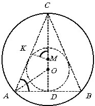 В осевом сечении конуса получили равнобедренный треугольник с вписанной и описанной окружностями. Отметим, что центры вписанной и описанной окружностей совпадают только у правильного треугольника. Если угол при вершине равнобедренного треугольника меньше 60°, то центр описанной окружности расположен на высоте ближе к этой вершине, чем центр вписанной окружности. Если треугольник прямоугольный, то центр описанной окружности совпадает с серединой гипотенузы, если же треугольник тупоугольный, то центр описанной окружности будет расположен вне треугольника, в то время как центр вписанной окружности для любого треугольника является внутренней точкой.