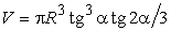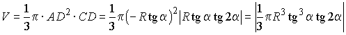 Шар радиуса R вписан в конус. Из центра шара образующая конуса видна под углом a. Найти объем конуса.