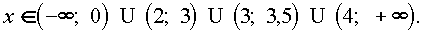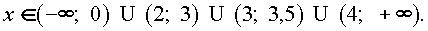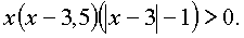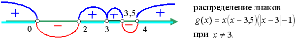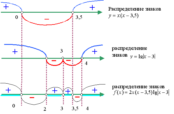 f(x) = 2x(x - 3,5)lg| x - 3| непрерывна при x № 3 и обращается в ноль в точках x1 = 0, x2 = 3,5, x3 = 2, x4 = 4. Таким образом (см. примеры использования метода интервалов в начале параграфа), определяем интервалы знакопостоянства функции f(x):|