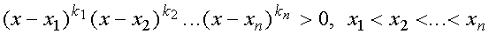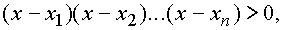 x1,x2,...,xn, которые разбивают её на интервалы знакопостоянства функции, стоящей в левой части неравенства. В промежутке справа от xn ставят знак “+”, затем, двигаясь справа налево, при переходе через точку xi меняют знак, т.е. левее xn ставят знак ”–”, затем “+” и т.д.Множество решений неравенства будет объединение интервалов, в каждом из которых поставлен знак “+”
