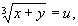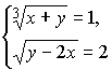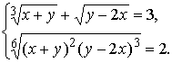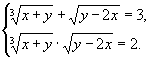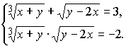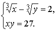 Воспользовавшись особенностью решения иррациональных кубических уравнений (см. “Иррациональные уравнения”) и вторым уравнением системы, после возведения в куб обеих частей первого уравнения получаем следующую систему уравнений