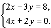 2x-3(-2x)= 8 или 8x= 8, откуда получаем x= 1. А значение второго неизвестного получим из соотношения y= -2x, т.е. y= -2.