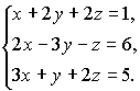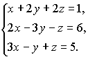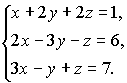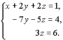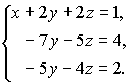 Из последнего уравнения находим z=2, подставим его во второе уравнение системы и найдем y= -2. Подставляя эти значения неизвестных в первое уравнение, находим x= 1.