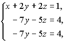 Теперь умножим второе уравнение на 5, а третье – на (-7) (уравниваем коэффициенты при неизвестном y) и сложим после этого последние два уравнения (первое и второе уравнение переписываем, а на месте третьего уравнения запишем результат сложения уравнений с выровненными коэффициентами при неизвестном y).