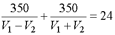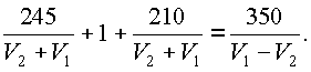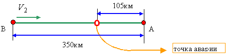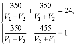 A находится от пристани B на расстоянии 350 км вниз по течению. Моторная лодка совершает рейс от A до B и обратно, не задерживаясь в B за 24 часа. В один из рейсов, возвращаясь из B в A, лодка потерпела аварию на расстоянии 105 км от A, что вызвало задержку лодки на один час. В результате аварии скорость лодки уменьшилась вдвое, и путь от B до B был пройден за такое время, как и путь от A до B. Найти скорость лодки в стоячей воде и скорость течения реки.Решение: