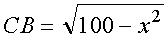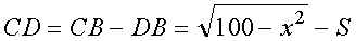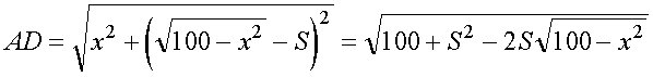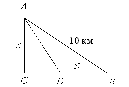 Обозначим расстояние от A до дороги через x, x < 10. D – точка, в которой автомобиль выезжает на дорогу. Пусть DB путь по дороге, пройденный автомобилем равен S км. Так как расстояние по прямой короче криволинейного пути, то будем полагать, что по полю автомобиль ехал по прямой AD.|