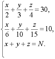 Пусть производительность первого рабочего x, второго – y, третьего z д/ед. времени. Время, которое они должны проработать, примем за единицу. Тогда искомое количество деталей N равно x + y + z.|