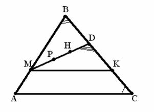 Указание. Пусть P,H - точки в DАВС и АС - наибольшая сторона. Рассмотрим ситуацию, как указано на рисунке, и без подробных обоснований (сделайте самостоятельно!) приведем схему рассуждений: полагаем МК½½АС, тогда МК £ АС. Так как АС³АВ, то ÐВ³ÐС. Но ÐMDK>ÐB, поэтому ÐMDK>ÐC=ÐMKD, а значит MK>MD и тем более АС>MD³PH.